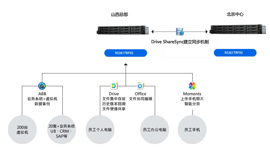 一份備份數據對公司的安全需求來說還不夠,借用群暉又進一步打造了異地備份容災方案。振東制藥山西總部的 RS3617RPXS 的備份數據,通過群暉 Drive ShareSync多分點同步功能復制到北京分公司的 RS3617RPXS 中。支持排程備份計劃。