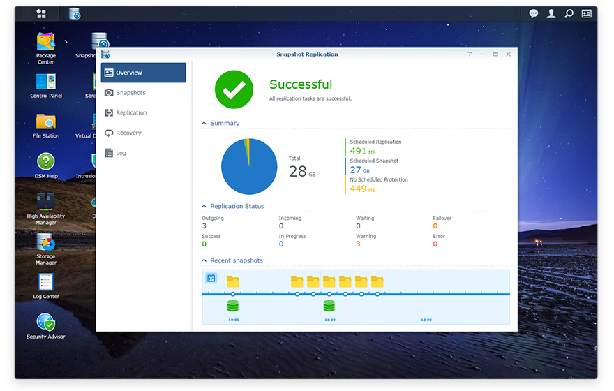 先進的 Btrfs 文件系統(tǒng)于特定 NAS 機種上支持新的快照技術(shù)。Snapshot Replication 讓你可頻繁地將數(shù)據(jù)從主要備份地點復寫到異地存儲空間 - 最多可以每 5 分鐘備份共享文件夾,每 15 分鐘備份 LUN,確保你存儲在共享文件夾的重要機密或 iSCSI LUN 中的虛擬機能從災難事件中快速地復原。
