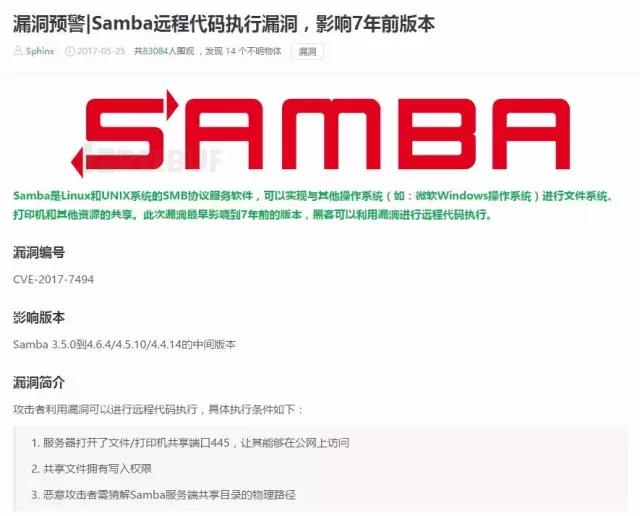 【群暉快報(bào)】2017年5月24日Samba發(fā)布了4.6.4版本,修復(fù)了一個(gè)嚴(yán)重的遠(yuǎn)程代碼執(zhí)行漏洞,漏洞編號CVE-2017-7494。該安全漏洞可以讓一個(gè)有權(quán)限的用戶提權(quán)至Samba所在服務(wù)器的root權(quán)限,進(jìn)而執(zhí)行惡意程序,向該服務(wù)器發(fā)動攻擊。